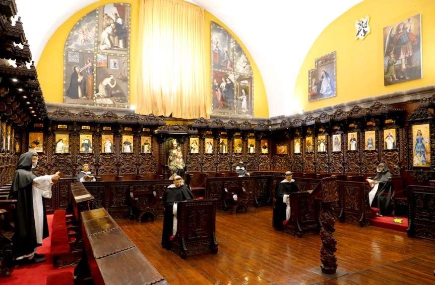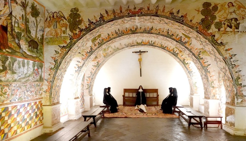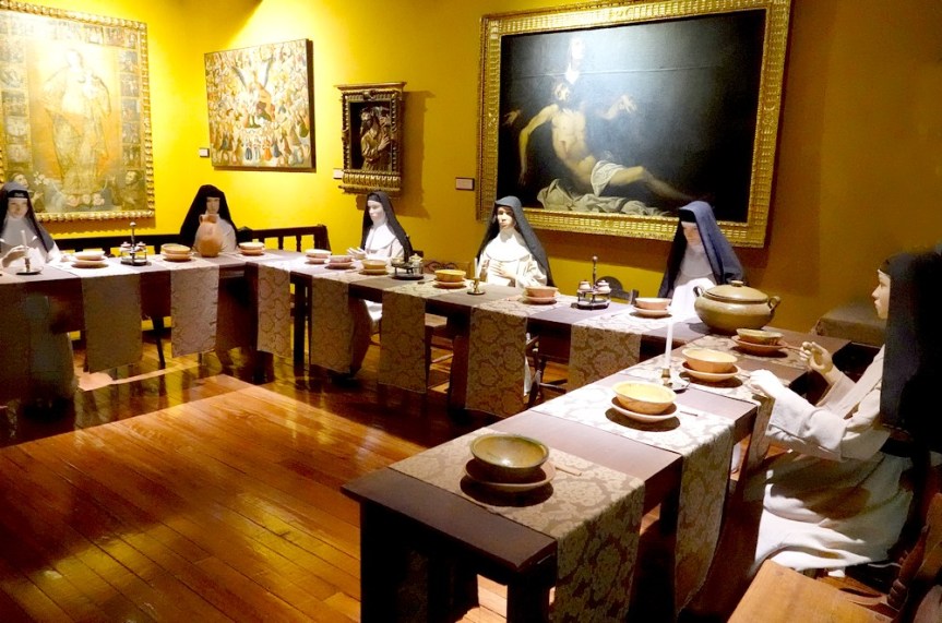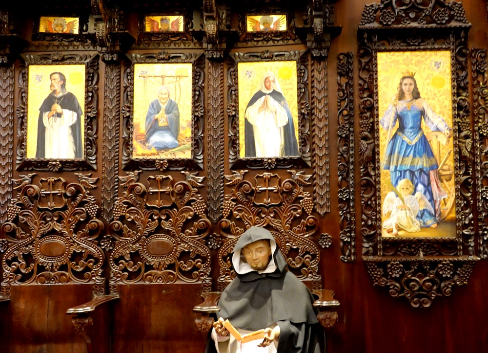 Juste en face du Museo Maximo Laura se dresse l’imposant Monastère de Santa Catalina qui abrite toujours un centre de formation religieuse pour la communauté des moniales de la vie contemplative. Nous visitons la partie ouverte au public et découvrons un univers inconnu… La congrégation, initialement fondée à Arequipa, dut déménager à Cusco en 1605, après l’éruption du volcan Huaynaputina. Le monastère porte le nom de Sainte Catherine de Sienne, italienne et fille d’un couple ayant eu 25 enfants. Très pieuse, elle tenait à rester éloignée des tentations du mode. Actuellement, une dizaine de nonnes vivent encore recluses, commençant leur journée par la prière de cinq heures du matin et l’achevant avec celle de vingt heures…