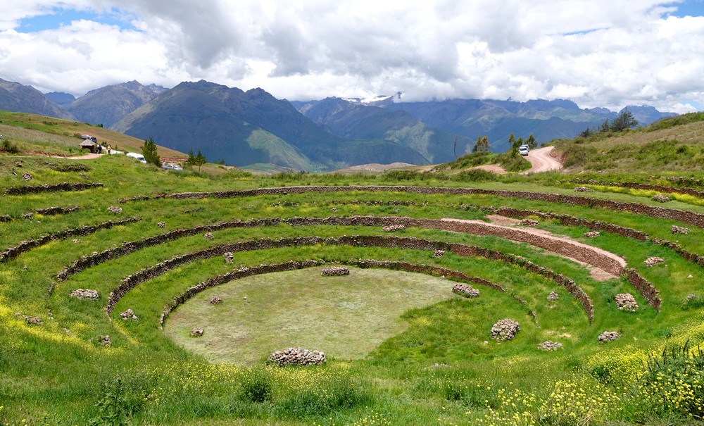 Dernière étape de la matinée, le site inca de Moray dont la forme des terrasses, en amphithéâtre, interpelle ! Ce lieu constituait probablement un centre de recherche agricole inca consacré à l’expérimentation de cultures dans les différents niveaux de hauteur de ses parcelles, arrosées au moyen d’un complexe système d’irrigation qui permettait la culture de plus de 250 espèces végétales. Chaque niveau de terrasse constitue un microclimat, obtenu grâce à la chaleur emmagasinée dans les murs en pierre. On suppose que les cultures testées sur le site de Moray étaient ensuite reproduites dans tout l’Empire Inca. Impressionnant !