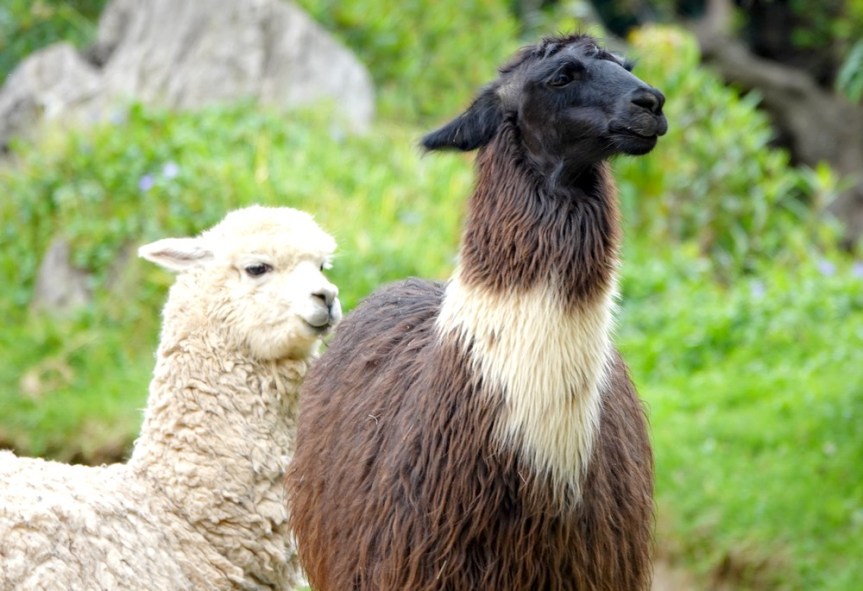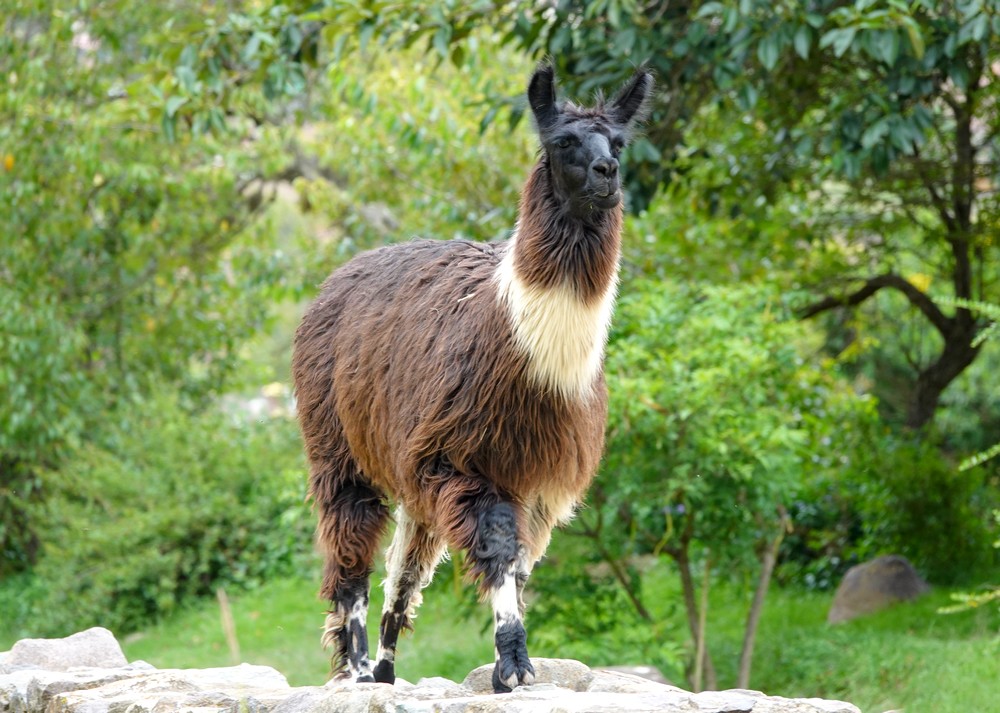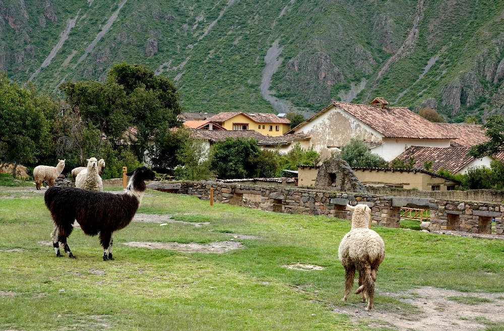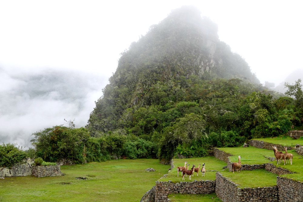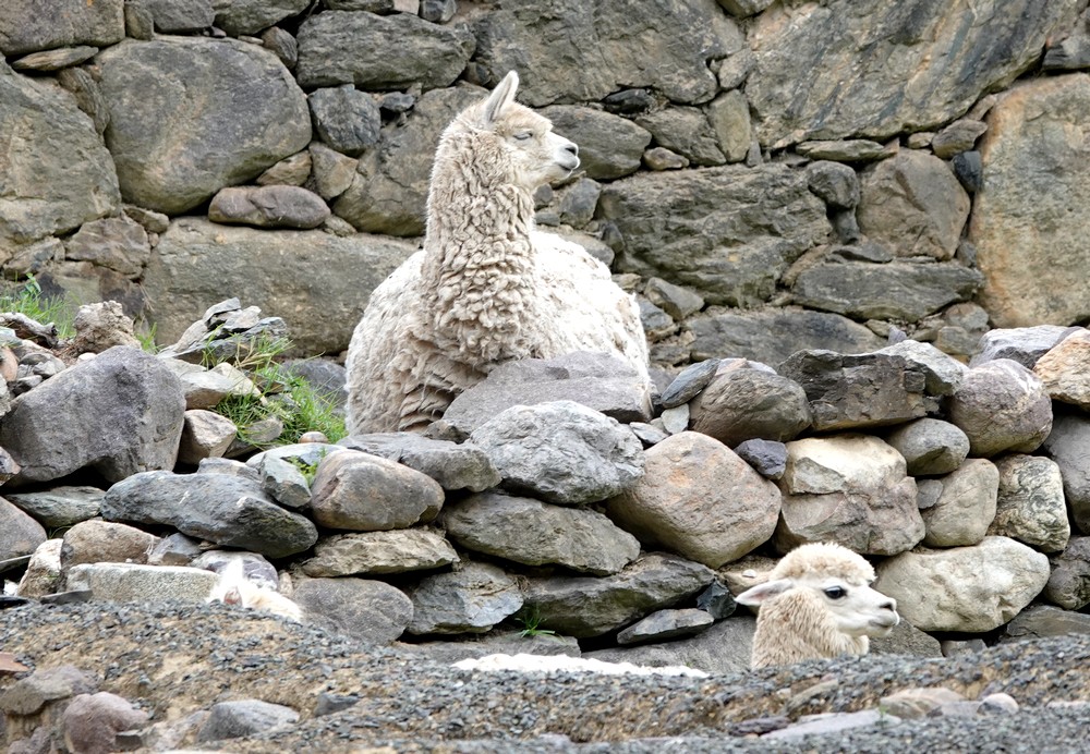 Avant de ressortir du site, nous visitons une zone anciennement agricole, avec de nombreuses terrasses et quelques murs qui laissent supposer qu’il y avait ici des habitations. Cinq lamas et alpagas occupent les lieux, servant ainsi de tondeuse à gazon naturelle ! Mais que l’on ne s’y trompe pas : sous leurs allures de grosses peluches, ces bêtes peuvent être parfois un brin agressives, comme a pu le constater Gérard qui s’est fait coursé, puis rattrapé par un grand mâle qui s’en est brusquement pris à sa veste et à son sac à dos… Et on le confirme maintenant, ce n’est pas une légende, un lama, ça crache fort !