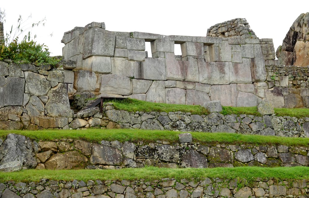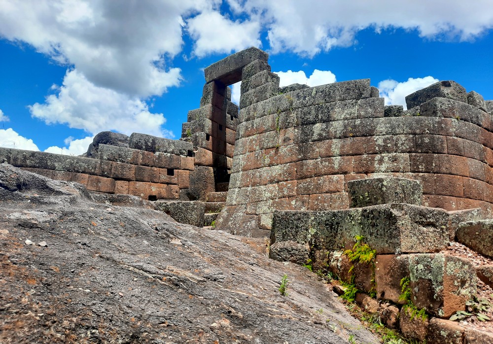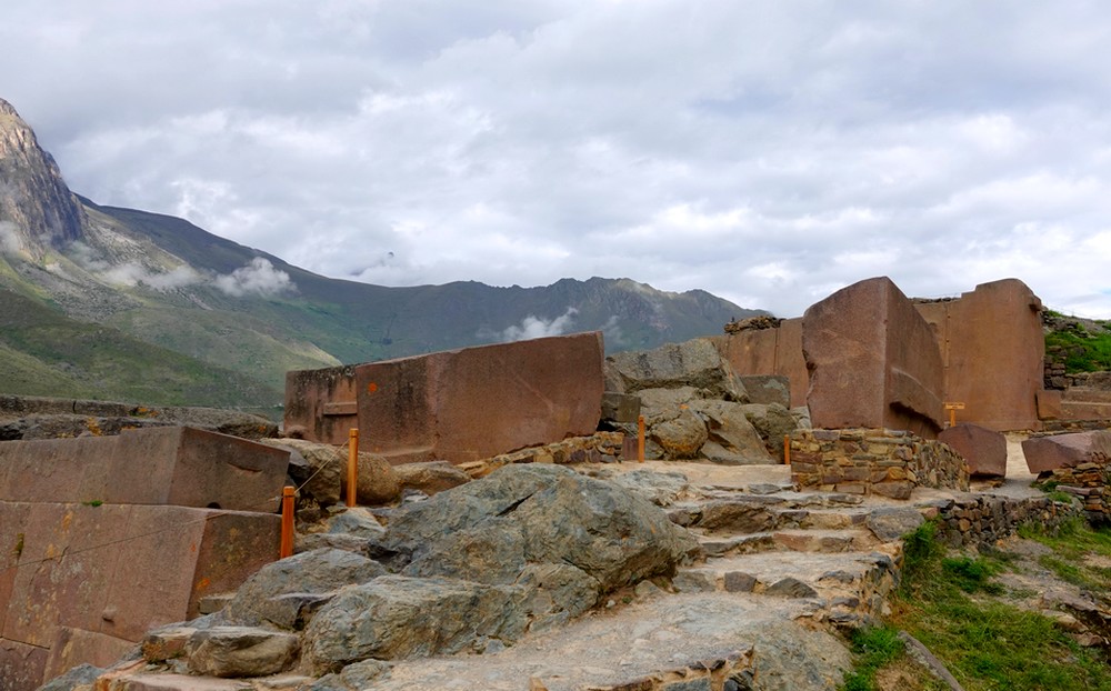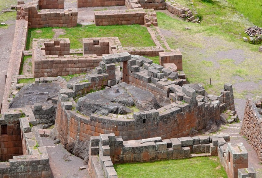 On atteint enfin le Temple du Soleil, tout en porphyre rouge, construit à partir de blocs de pierre colossaux parfaitement ajustés. Six monolithes de couleur rose constituent une énorme paroi ayant une forme géométrique représentant le cycle de la vie. Très impressionnant quand on sait le travail qu’il fallait pour acheminer ces blocs jusqu’en haut de la colline : les pierres provenaient d’une carrière située à 6km de là, puis elles étaient transportées par des milliers d’ouvriers grâce à des plans inclinés. Certaines pierres, trop lourdes ou abimées, étaient abandonnées en chemin. Ensuite, les Incas utilisaient la forme naturelle des pierres et les taillaient avec des outils robustes comme l’hématite. Le plus surprenant est que, selon la technique inca, l’assemblage des blocs de pierre se faisait sans joints visibles ni mortier. Sur certains d’entre eux, on voit des bosses ou des saillies : elles servaient probablement à fixer des cordes afin de soulever les pierres, ce qui peut laisser supposer que le site n’était pas achevé à l’arrivée des envahisseurs espagnols.