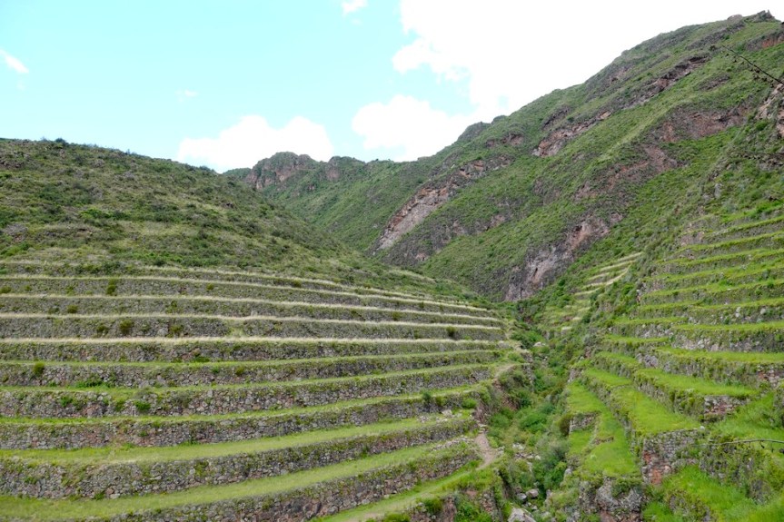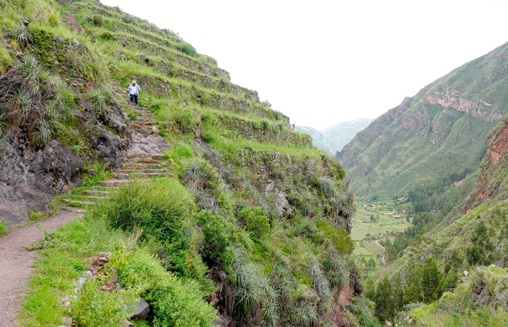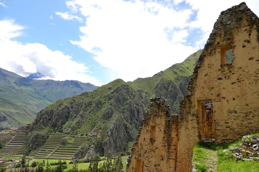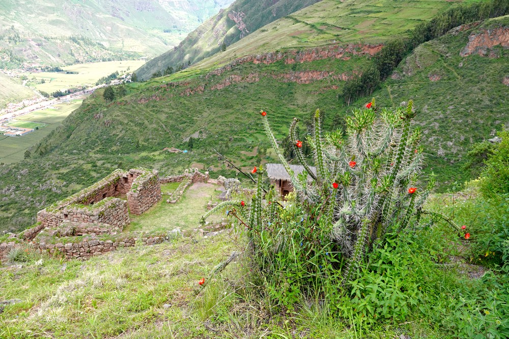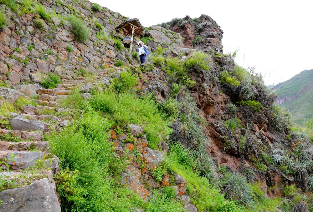 Arrivés vers 8h30, nous attaquons immédiatement la balade et nous nous dirigeons vers la citadelle – Qallaq’asa en quechua – construite sur un éperon rocheux qui domine la vallée et dont on comprend aisément la fonction militaire et défensive. Nous longeons une série de terrasses étroites, sûrement les plus belles de la vallée ! Si leur usage premier était d’y cultiver diverses plantes, elles servaient aussi à anticiper l’érosion des sols en montagne.