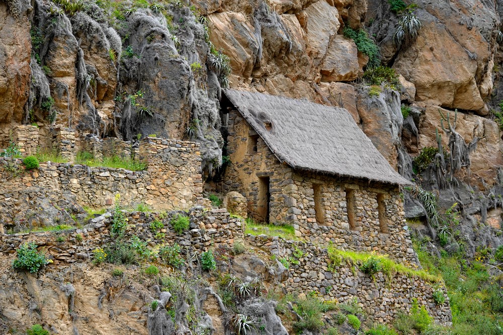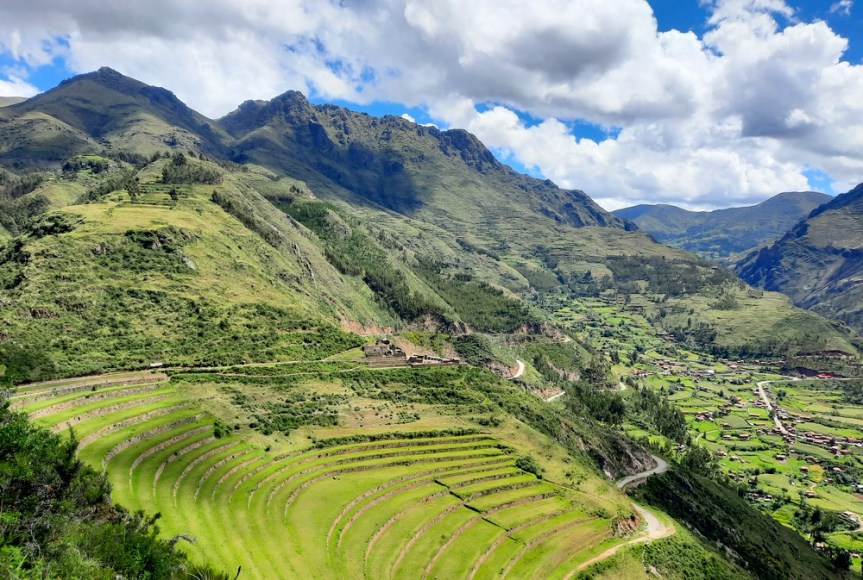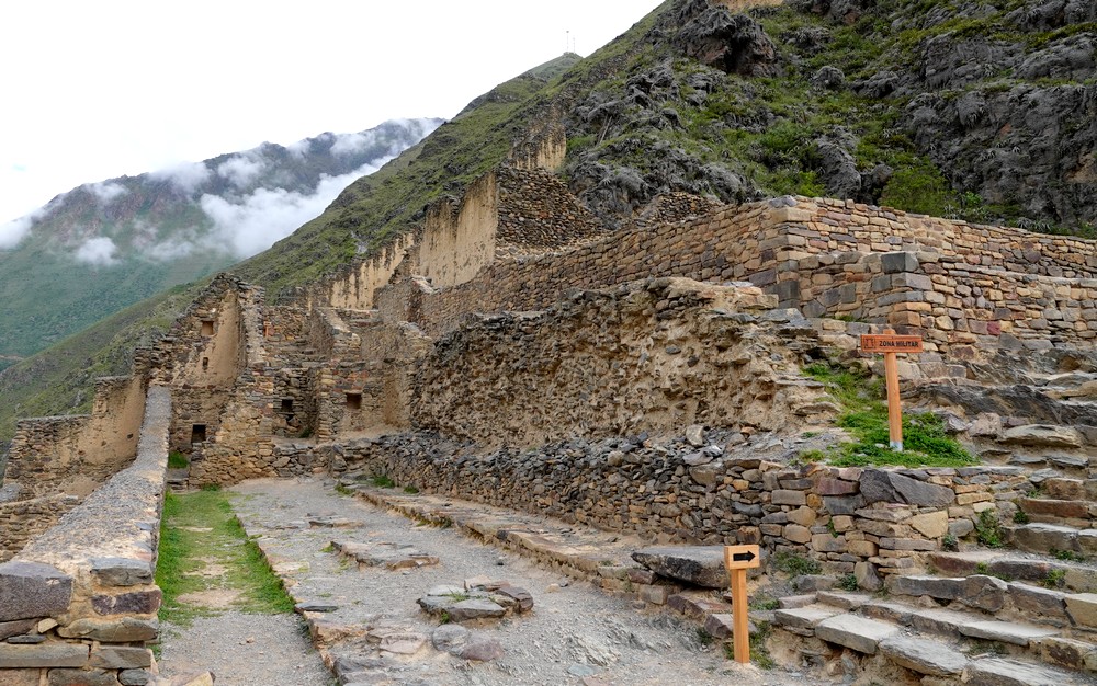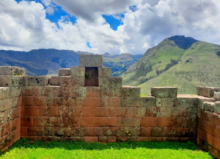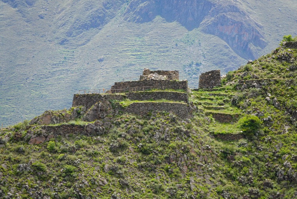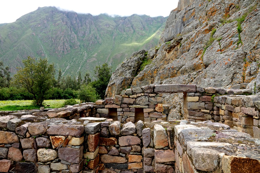 Arrivés vers 8h30, nous attaquons immédiatement la balade et nous nous dirigeons vers la citadelle – Qallaq’asa en quechua – construite sur un éperon rocheux qui domine la vallée et dont on comprend aisément la fonction militaire et défensive. Nous longeons une série de terrasses étroites, sûrement les plus belles de la vallée ! Si leur usage premier était d’y cultiver diverses plantes, elles servaient aussi à anticiper l’érosion des sols en montagne.