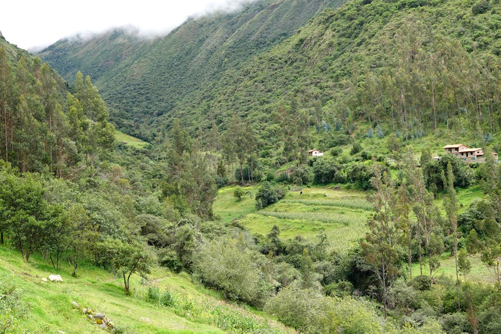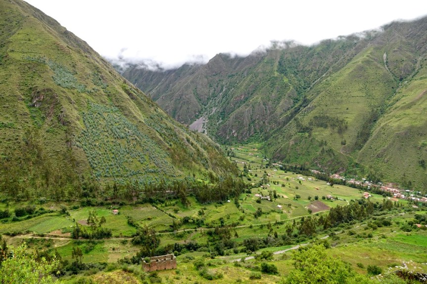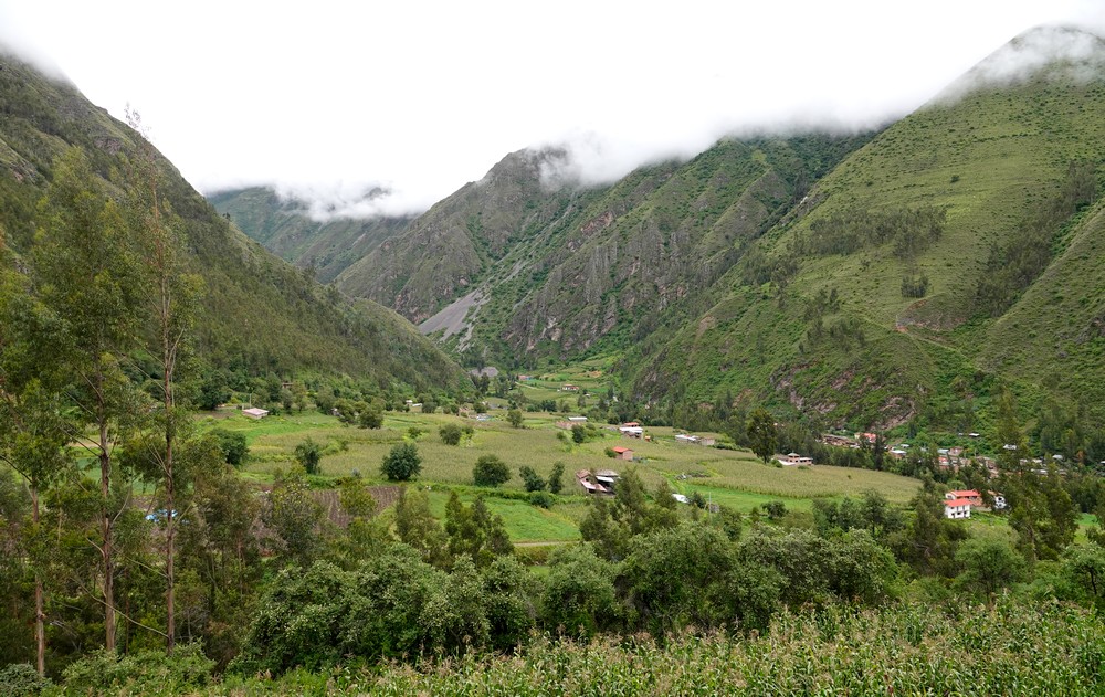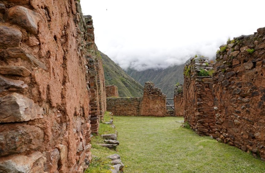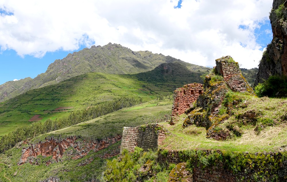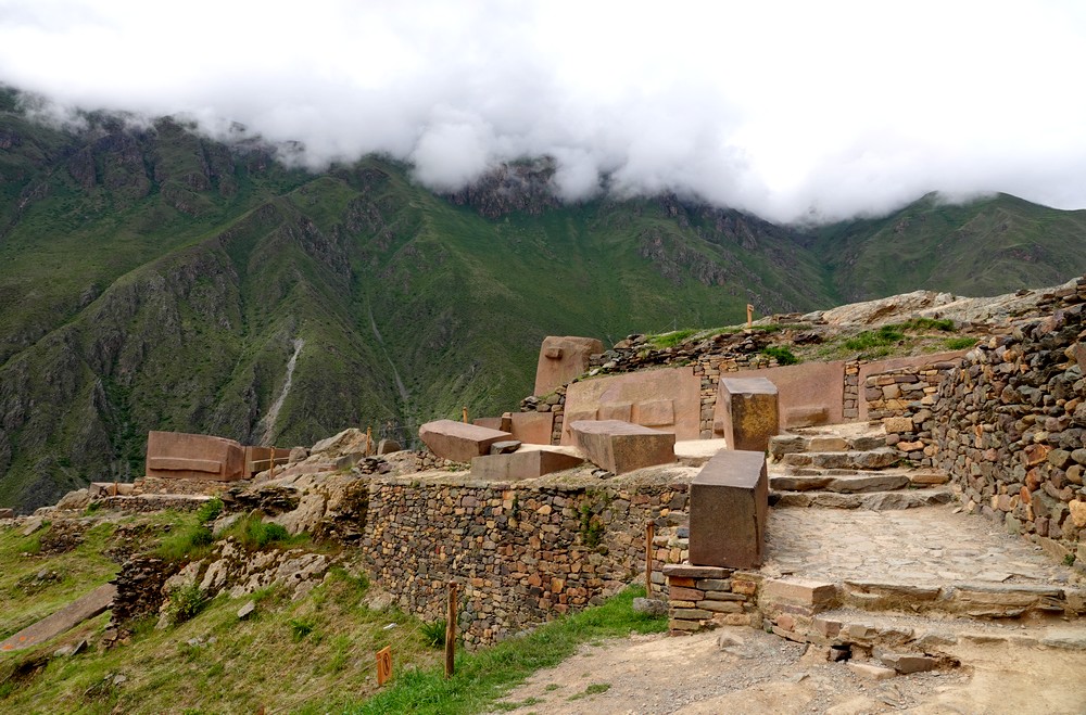 Samedi, la météo est toujours incertaine… Nous décidons tout de même d’aller faire un tour dans la vallée qui file au nord-est vers Pallata et nous demandons à un tuktuk de nous déposer en contrebas des ruines de Pumamarka. Là, nous hésitons : soit on redescend vers Ollantaytambo, soit on grimpe vers le site archéologique. On vote pour la seconde option, et c’est parti pour une marche interminable, sur une piste qui s’élève tranquillement mais sûrement vers le sommet de la montagne. Après 4km de grimpette, nous parvenons enfin à un sentier qui mène aux ruines d’une forteresse pré-inca, perchée à 3600m d’altitude. Le site est modeste mais agréable à visiter ; là, on hésite encore, soit on rebrousse chemin par le même itinéraire, soit on tente de rentrer à Ollantatambo par un trail a priori bien tracé. Comme il commence à pleuvioter, on joue la sécurité, et on redévale rapidement le chemin emprunté à l’aller. Parvenus à la route – en réalité, ce serait plutôt une piste caillouteuse – en l’absence de tout transport, nous faisons du stop, et vingt minutes plus tard, nous sommes attablés au Quinua !