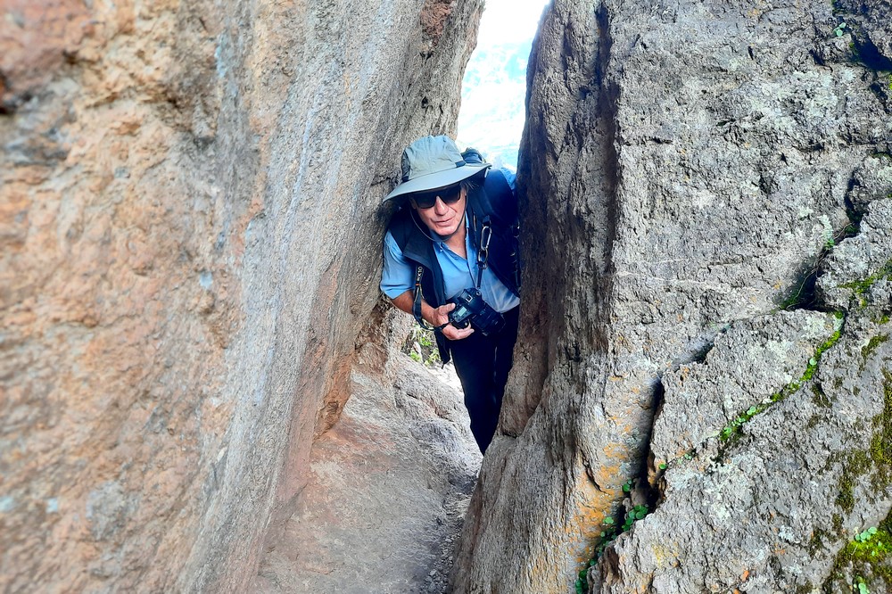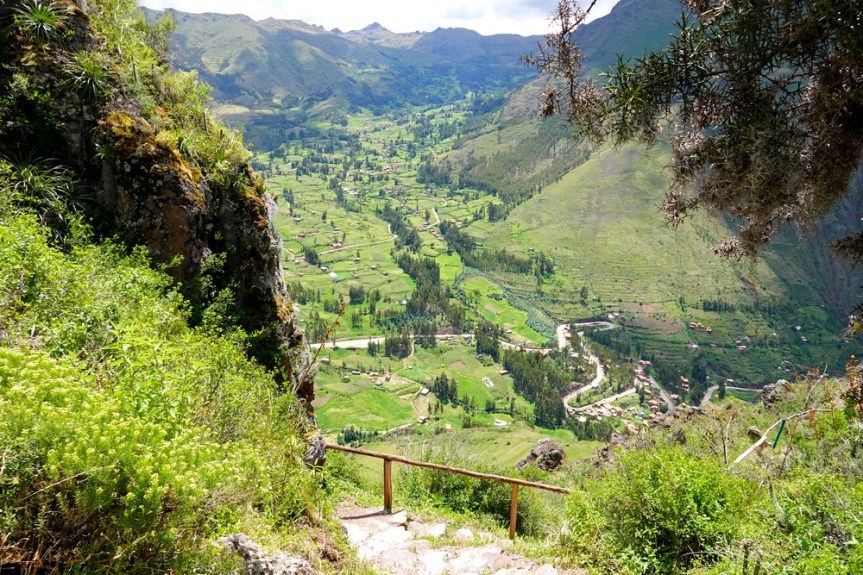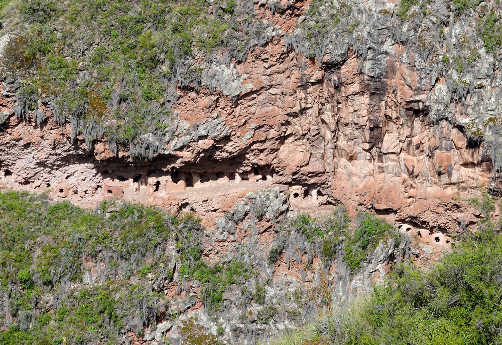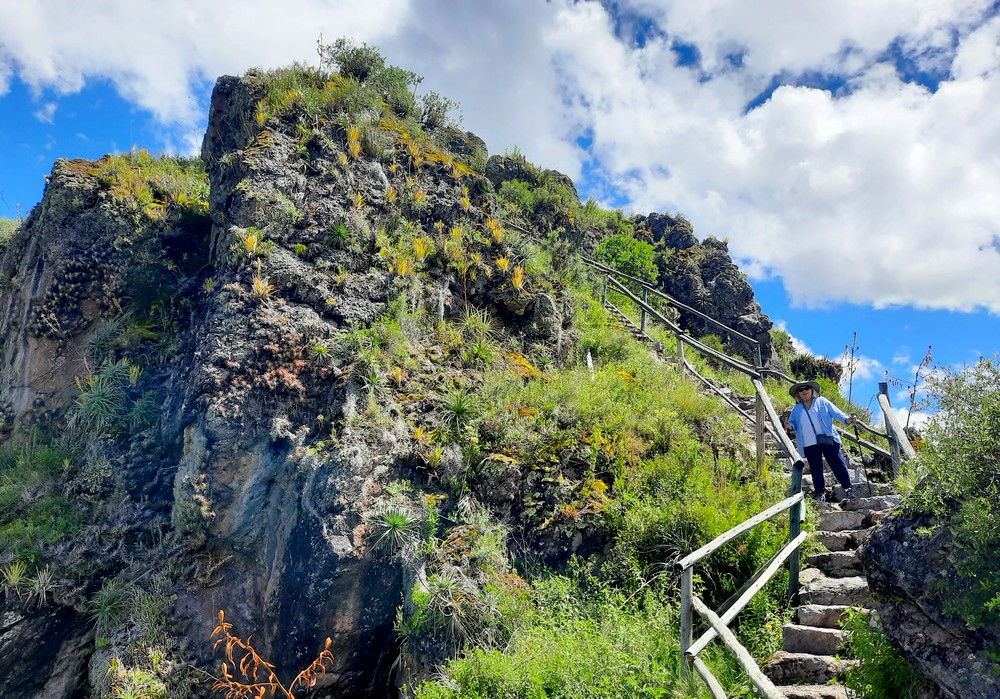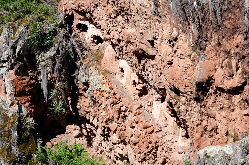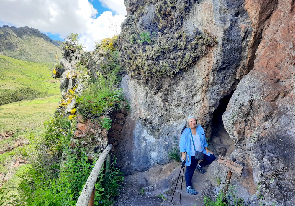 Le fléchage étant discret, nous empruntons un sentier qui monte, sans vraiment savoir où il nous mènera. Au passage, nous apercevons les vestiges du plus grand cimetière inca d’Amérique du Sud. Finalement, nous parvenons à un mirador perché à 3525m d’altitude qui offre une vue splendide sur les environs ! Alors que nous pensions devoir rebrousser chemin, nous nous apercevons que le sentier se poursuit, de manière assez abrupte par moment, jusqu’à un étroit tunnel puis continue à descendre à flanc de colline.