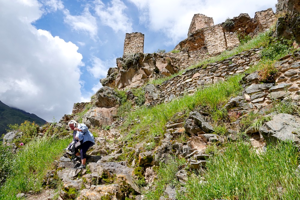 Après un bon moment passé dans le secteur haut des ruines, nous décidons de prendre encore plus de hauteur et de grimper jusqu’à l’Inka Watana qui offre un superbe belvédère sur la vallée et sur le site archéologique Pinkuylluna, édifiée à flanc de falaise.