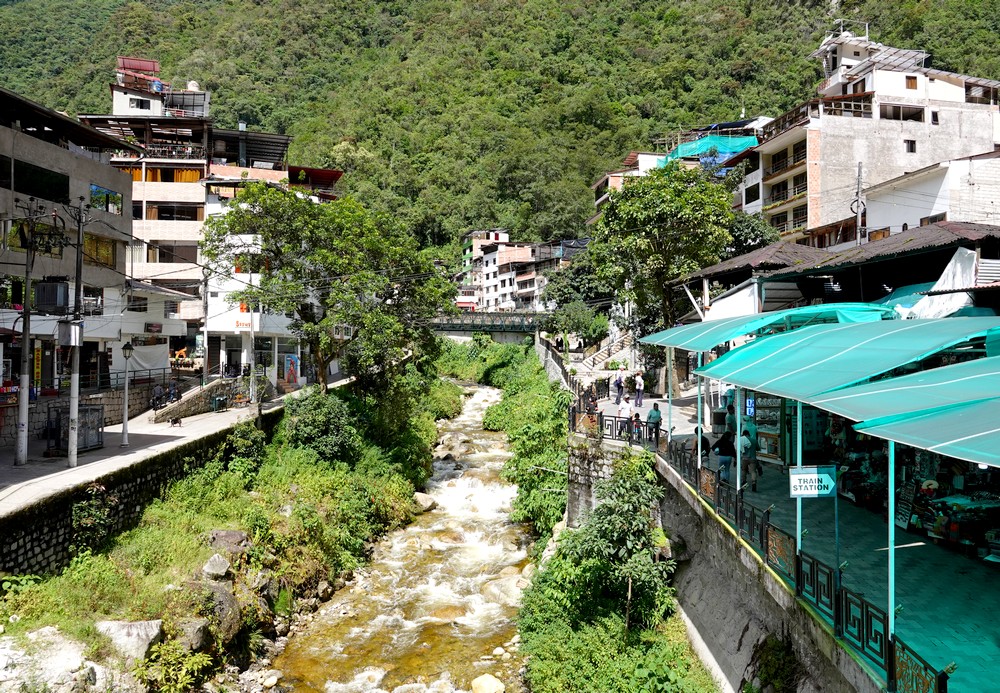 Nous débarquons à Aguas Calientes vers 14h ; la petite ville, fondée en 1901 lors de la construction de la ligne du chemin de fer, est totalement encaissée au pied de hautes falaises. D’ailleurs, aucune route d’accès ne la relie aux vallées voisines, seul le train assure le transport des passagers et des marchandises. Nous déposons nos sacs à l’hôtel puis nous nous baladons un moment dans les rues intégralement dédiées aux touristes de passage – restaurants et boutiques de souvenirs se succèdent, même le long des rails. Après un Pisco Sour et un hamburger, nous ne trainons pas et rentrons à l’hôtel… demain le réveil sonnera très tôt !