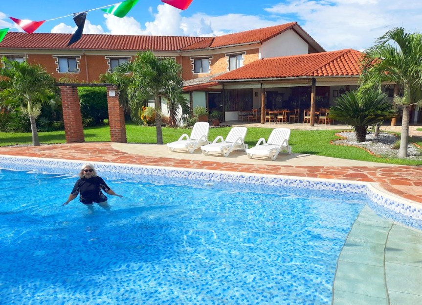 Un premier taxi nous dépose sur la place principale où nous déjeunons face à la très belle église jésuite, et un second nous emmène à l’hôtel La Villa Chiquitana, légèrement excentré – nous aurions pu y aller à pied, mais avec les bagages et la chaleur intense, nous renonçons ! Sitôt installés, nous filons nous rafraichir à la piscine… et en fin de journée, nous enchainons avec une bonne caïpirinha, la première depuis plusieurs semaines, puis poursuivons avec un succulent dîner, pas mécontents que cette journée fatigante s’achève enfin !