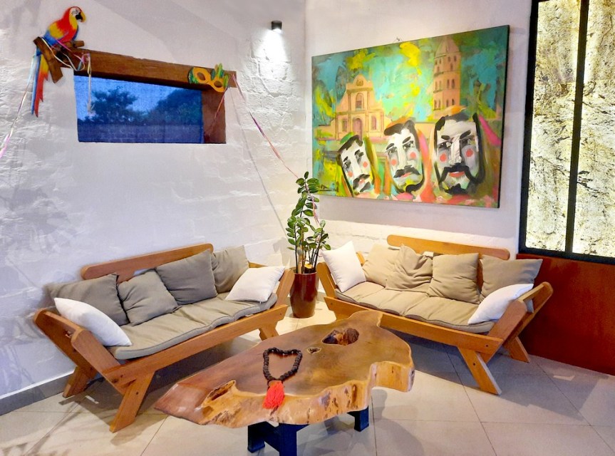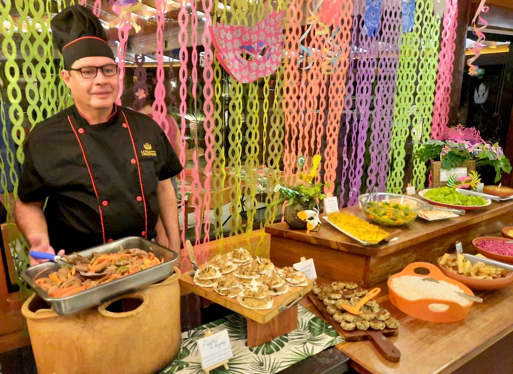 Ce qui nous surprend le plus, en ville et à l’hôtel, c’est la multitude de masques, tous représentants un visage blanc aux joues rouges et à la petite moustache noire – appelés ici máscara de Abuelo ou masque du grand-père. Certes, nous sommes en période de Carnaval, mais on comprend vite qu’il s’agit d’un fort symbole de la région. Effectivement, ces masques, apparus au moment de la colonisation espagnole, étaient principalement destinés à se moquer de l’homme blanc, autrement dit des missionnaires !