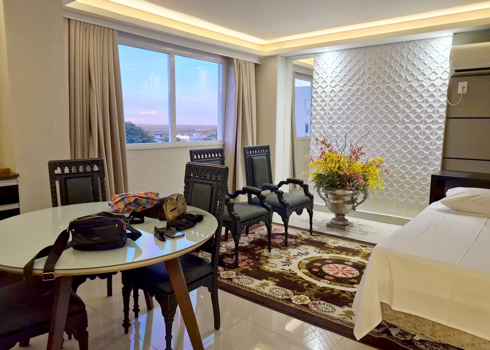 - Nacional Palace Hotel, à Corumba, très bien situé à deux cuadras de la place principale et des restaurants. Sûrement le plus bel hôtel de la ville, accueil agréable, piscine, bar, salon. Excellent petit-déjeuner. Très belle suite avec jacuzzi (nous avons été surclassés), environ 80€ la nuit avec le petit-déjeuner. On recommande !