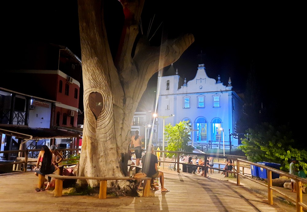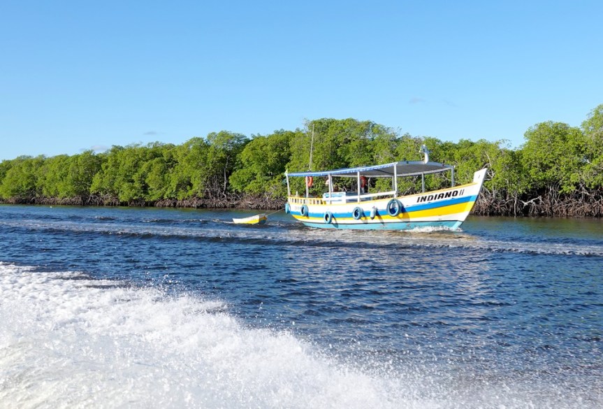 Vers 14h30, le groupe est de nouveau réuni et nous rembarquons pour un nouvel arrêt dans une piscine naturelle. Pour être honnête, ces haltes sont surtout prétextes à consommer dans les bars flottants. Pas trop notre truc, à cette heure et en plein soleil, mais pour certains, c’est un passage obligé ! Nous repartons ensuite vers Canavieiras, un minuscule village connu pour ses restaurants flottants servant huitres et… cocktails ! Au passage, nous pensions avoir le temps d’observer la mangrove, mais le bateau file tellement vite que c’est vraiment compliqué d’apercevoir quelque chose… L’arrêt à Canavieiras s’éternise, nous passons le temps devant un jus de fruits avant de repartir enfin vers Cairu, une petite ville dotée d’une très belle église baroque. Eglise que nous ne verrons pas car le pilote du bateau a décidé qu’il n’y aurait que 7mn d’arrêt – ben oui, ici il n’y a pas de bars, donc les autres membres du groupe manquent de motivation pour bouger ! Le retour au Morro s’effectue de nuit, toujours à grande vitesse, une sensation assez peu agréable, d’autant que la musique réclamée par certains déchire nos tympans – l’idée étant de couvrir le bruit des deux moteurs. Bref, on l’aura compris, hormis le beau moment passé sur la sublime plage de Boipeba, cette excursion ne nous a guère enchantés… Néanmoins, elle nous aura permis de rencontrer Elisandra et son papa avec qui nous avons tout de suite sympathisé !