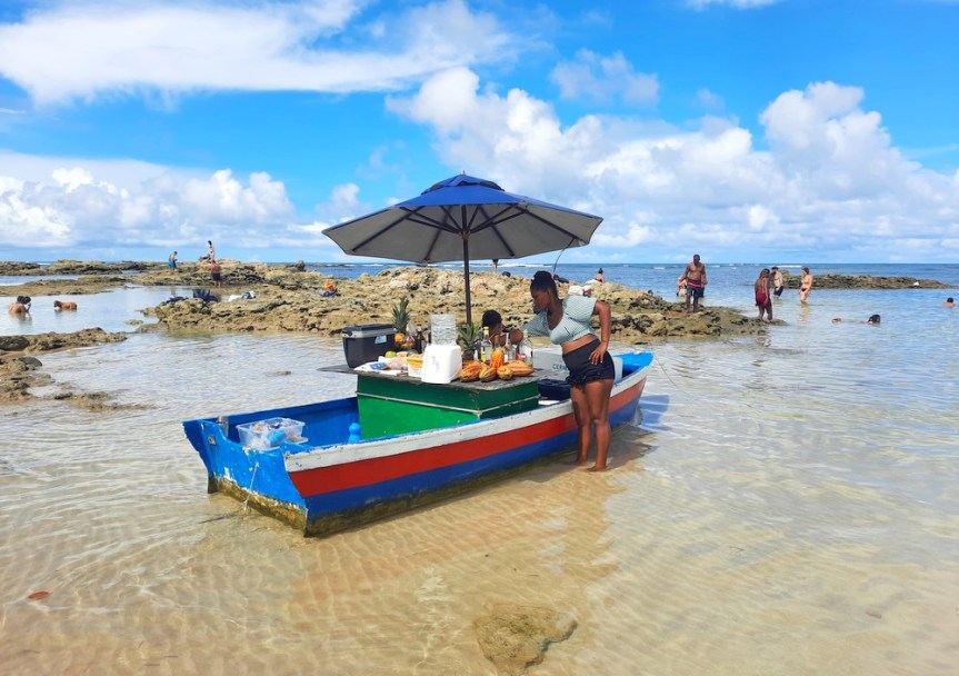 Comme nous avons déjà publié un article très complet sur cette destination (Ambiance festive, balnéaire et sportive au Morro de São Paulo), celui-ci sera plus succinct… Quoi qu’il en soit, comme en 2022, c’est en brouette que nos bagages sont hissés du quai d’arrivée à notre hôtel. Eh oui, sur l’ile, les véhicules sont rares – on croise principalement l’ambulance, les quads des policiers et le tracteur des poubelles – mais la pente est raide ! Sitôt installés à la Pousada O Casarão – c’est une des plus anciennes maisons de l’ile – nous filons à la plage. Et hop, on redescend !