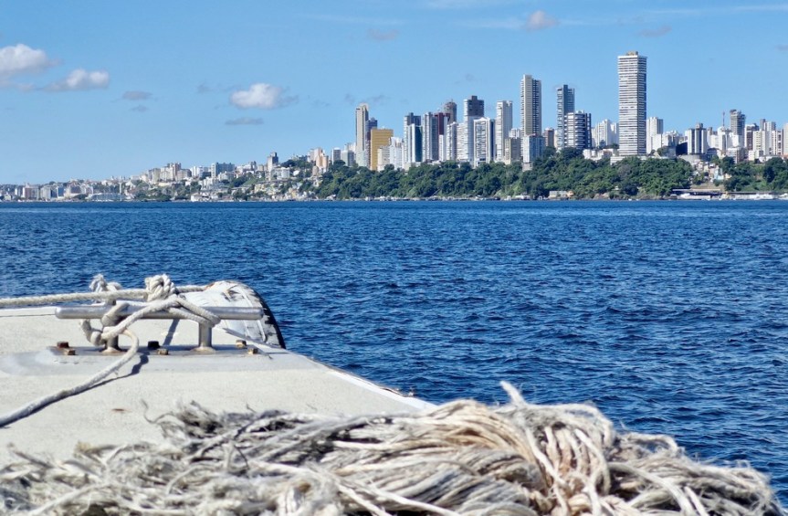 A regret, notre séjour au Morro de Sao Paulo s’achève… Il nous faut recharger les bagages dans la brouette et descendre au port. Après une petite attente, nous embarquons dans le bateau pour Salvador et peu à peu, ces plages paradisiaques s’éloignent. La mer est houleuse, heureusement que la traversée ne dure que deux heures trente ! Sitôt débarqués, nous sautons dans un taxi qui nous mène à notre hôtel, un magnifique établissement idéalement situé à deux pas de la vieille ville.