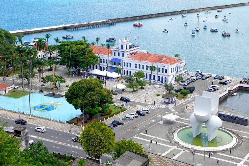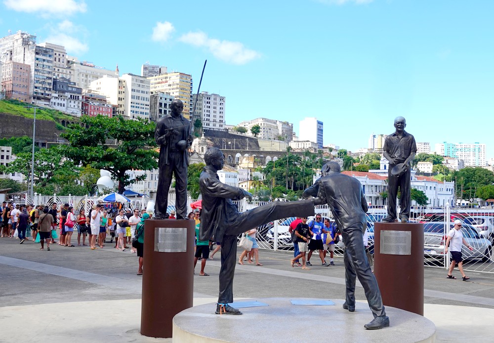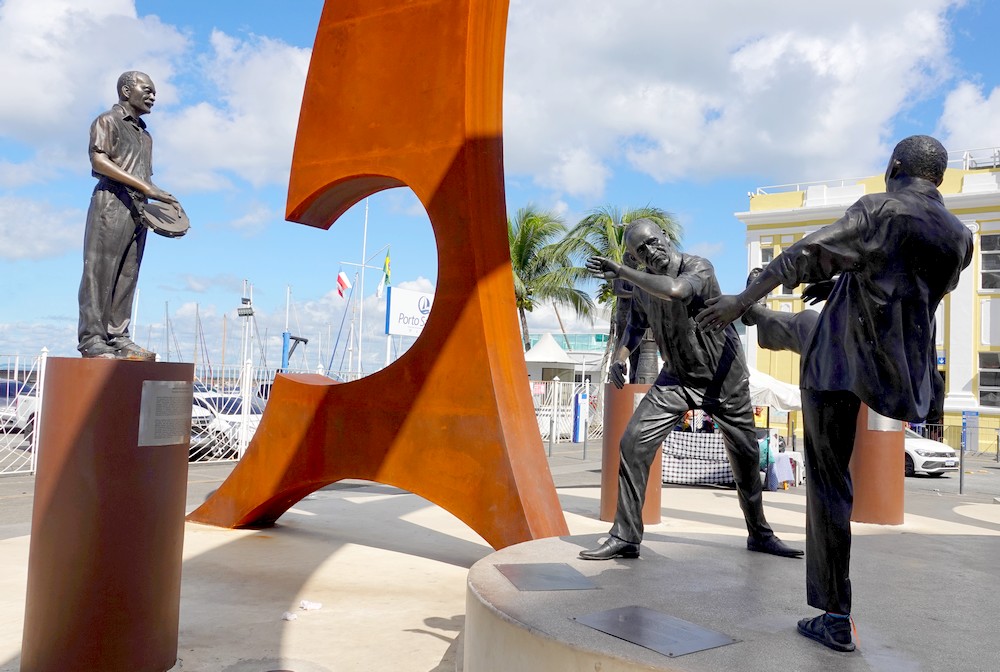 Vendredi matin, pour le plaisir, nous retraversons tout le Pelourinho pour rejoindre l’ascenseur Lacerda qui, en quelques secondes, nous mène non loin du Mercado Modelo – nous ne nous y attardons pas, à 9h l’activité est encore très réduite. En revanche, nous passons un bon moment à l’Arena da capoeira qui rend hommage aux maitres de cet art martial afro-brésilien. Inauguré en 2024, cet ensemble de sculptures habille remarquablement la place qui autrefois était laissée à l’abandon.