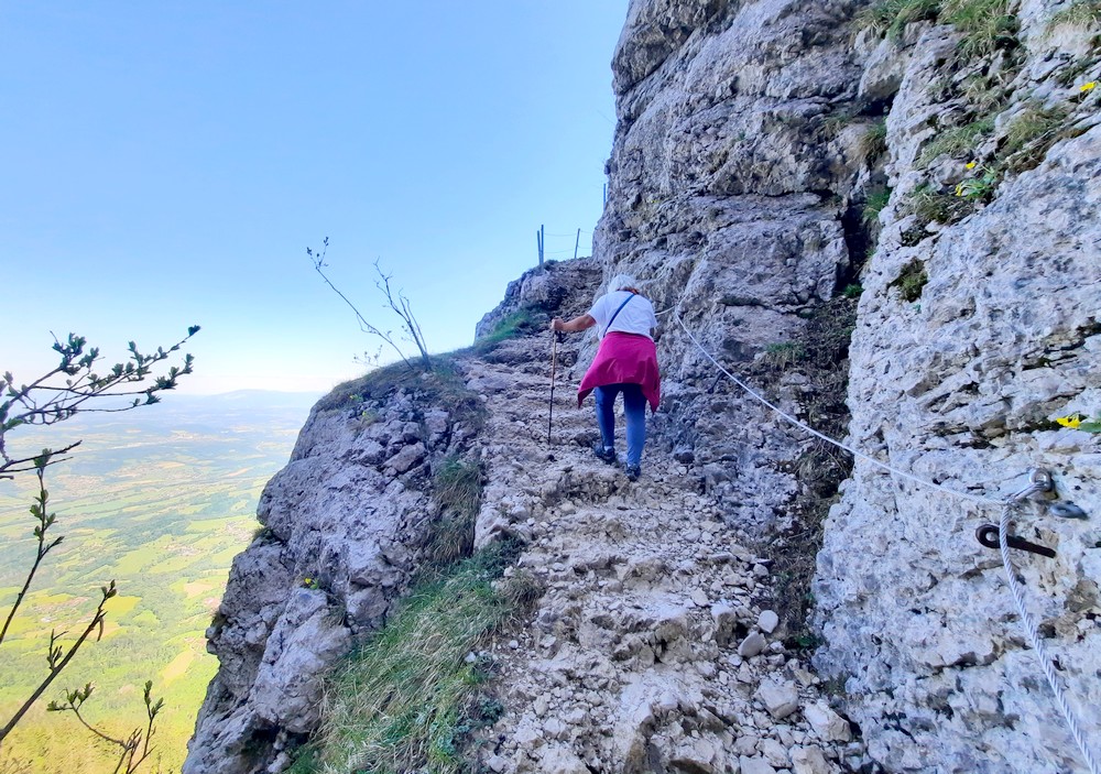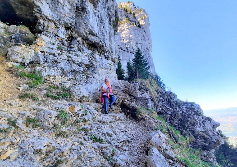 Depuis notre séjour au Brésil, nous n’avons pas eu l’occasion de randonner. C’est pourquoi la fille de Gérard nous a concocté un programme de remise en jambe avec une promenade au Parmelan, un secteur que nous ne connaissons pas du tout. Ce sera plat, nous a-t-elle affirmé… C’est drôle, mais la dernière fois que j’ai entendu cette petite phrase anodine, on s’est retrouvé à avaler 400m de dénivelé positif à plus de 5.000m d’altitude ! Nous voilà donc partis vers 9h – un samedi, c’est indispensable car il y a vite foule – dans une boucle qui doit nous faire passer à l’aller par le Grand Montoir, et au retour par le Petit Montoir. Evidemment, le parcours est loin d’être plat – il est même très pentu, avec un bon 700mD+, et certains passages sont sécurisés par un câble… Mais l’effort en vaut la peine car les vues sont magnifiques !