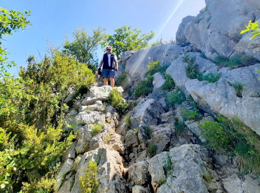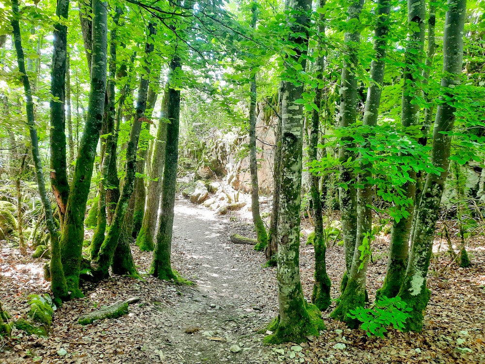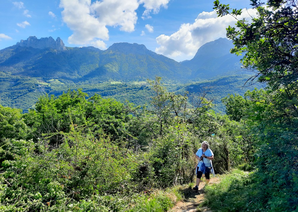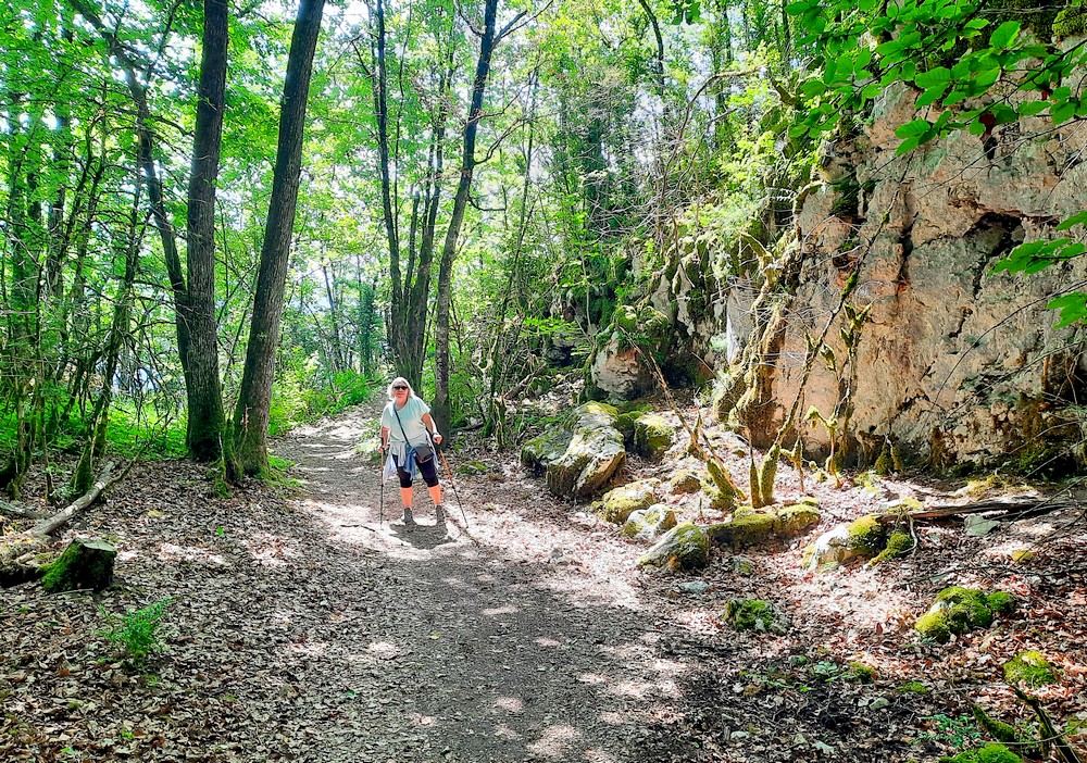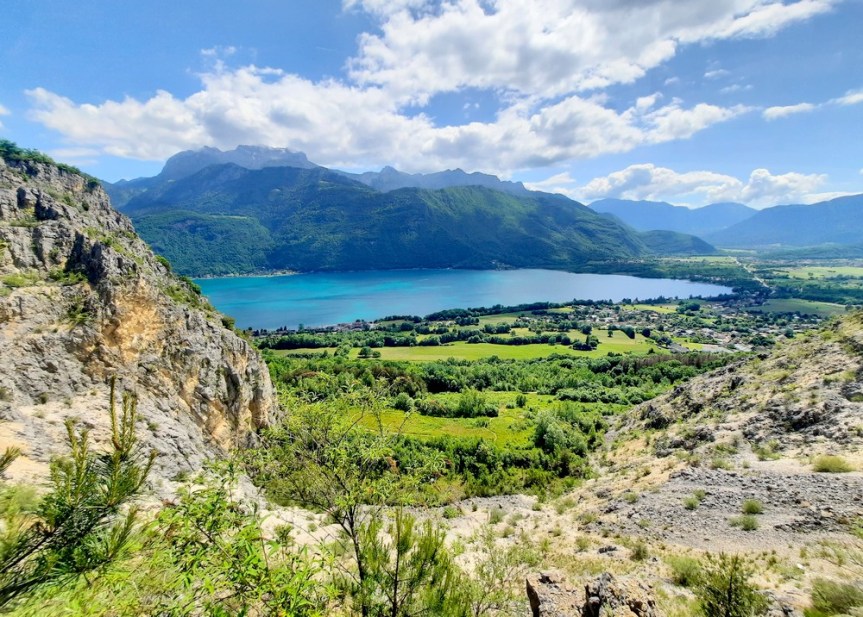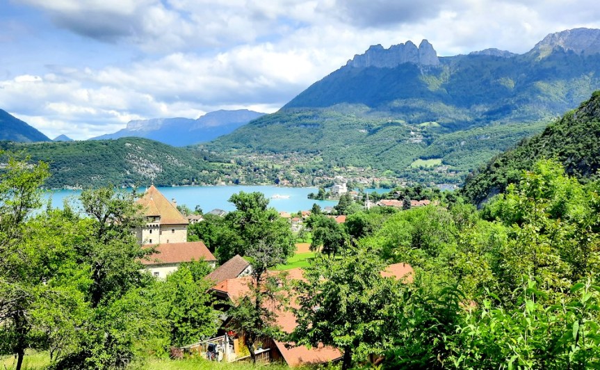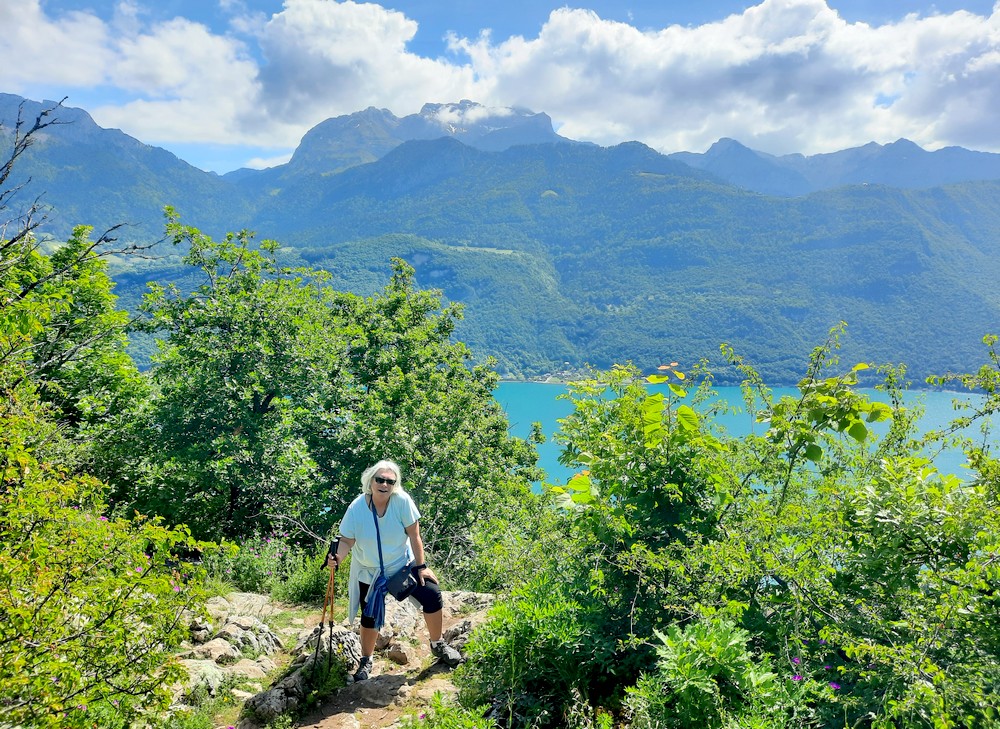 Accessible facilement à vélo depuis le camping, le départ de cette balade se situe à Duingt, sur la rive ouest du lac. Et c’est parti pour une belle grimpette qui, au départ, nous fait suivre un ancien chemin de croix. Le sentier se poursuit ensuite dans une forêt peu épaisse mais suffisamment ombragée pour nous éviter le coup de chaud ! Sans être très difficile, cette splendide rando demande une certaine expérience de la marche et il faut parfois s’aider des mains pour franchir certains passages rocheux – et là, il n’y a aucun câble pour aider ! Mais les splendides vues sur le lac nous font vite oublier ces petites difficultés…