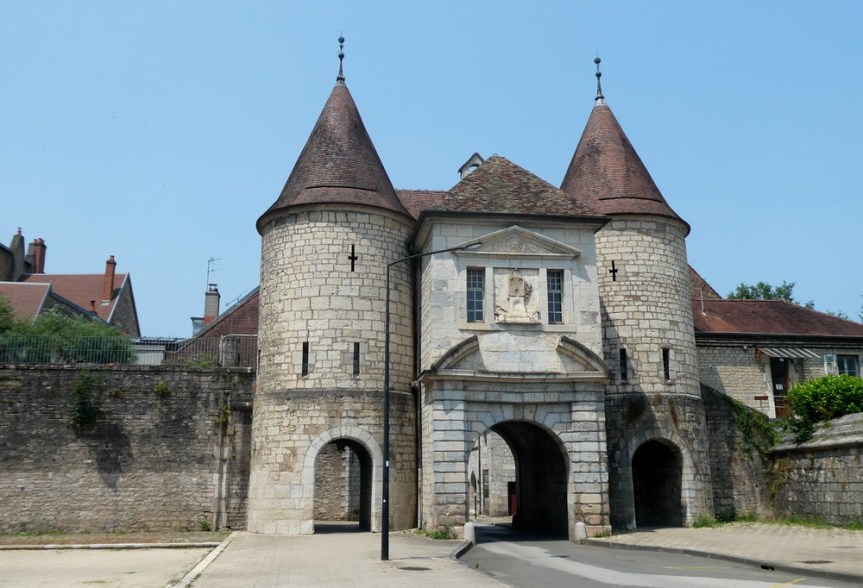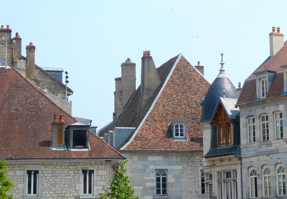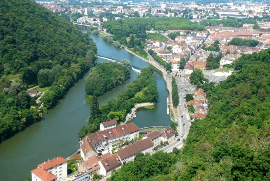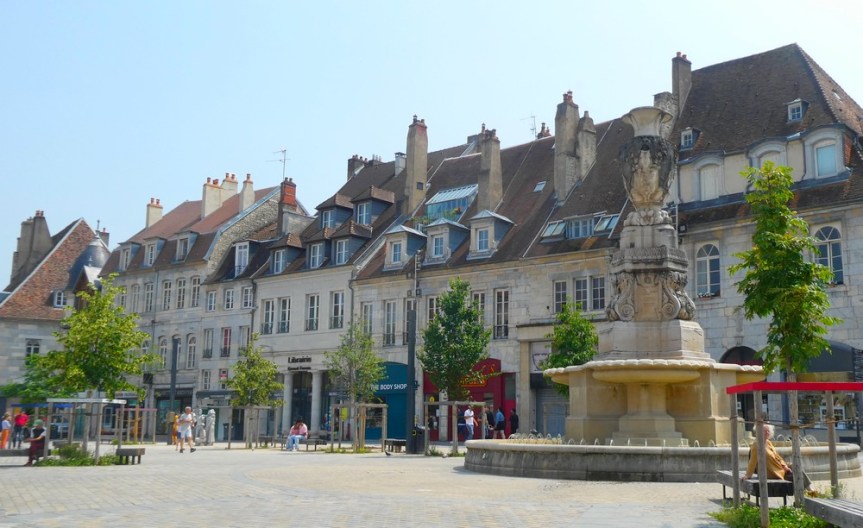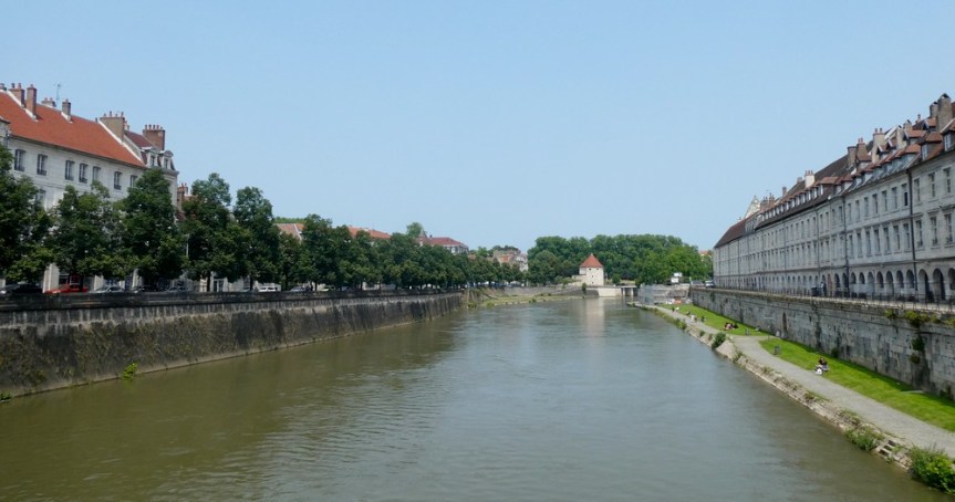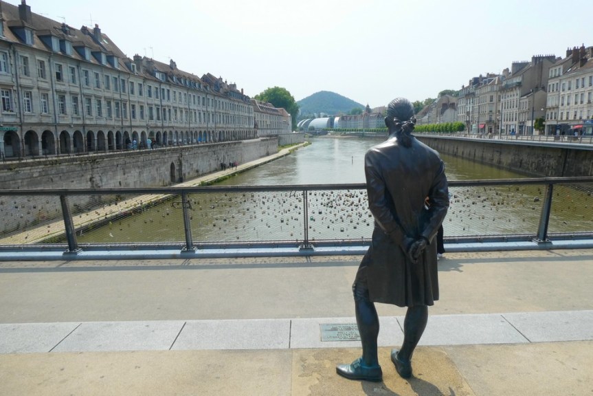 Classée ville d’Art et d’Histoire, Besançon possède un riche passé historique dont son patrimoine architectural est un témoin fort. Depuis la fondation d’un oppidum gaulois, la cité n’a cessé de se développer et de s’agrandir avant de devenir un centre culturel, militaire et économique de premier ordre. Tantôt germanique tantôt française, la capitale comtoise a gardé de nombreuses traces des différentes périodes de son histoire de l’Antiquité au XIXe siècle. (source Wikipedia) Bâtie dans une boucle du Doubs – d’ailleurs, le quartier historique est surnommé La Boucle – au pied d’une imposante citadelle, la cité était autrefois cernée de fortifications ; aujourd’hui, il subsiste principalement six tours bastionnées édifiées sur ordre de Vauban. Arrivant depuis la piste cyclable qui longe le Doubs, nous pénétrons dans la ville par la porte Rivotte dont un soleil, emblème de Louis XIV, orne le fronton. On flâne ensuite au hasard des rues et des places jusqu’au Pont Battant dont l’origine remonte à l’époque romaine – bien sûr, au fil des siècles le pont a subi maintes transformations ; ainsi, au Moyen-Age il était couvert d’échoppes tandis qu’aujourd’hui, trams, véhicules et piétons cohabitent.