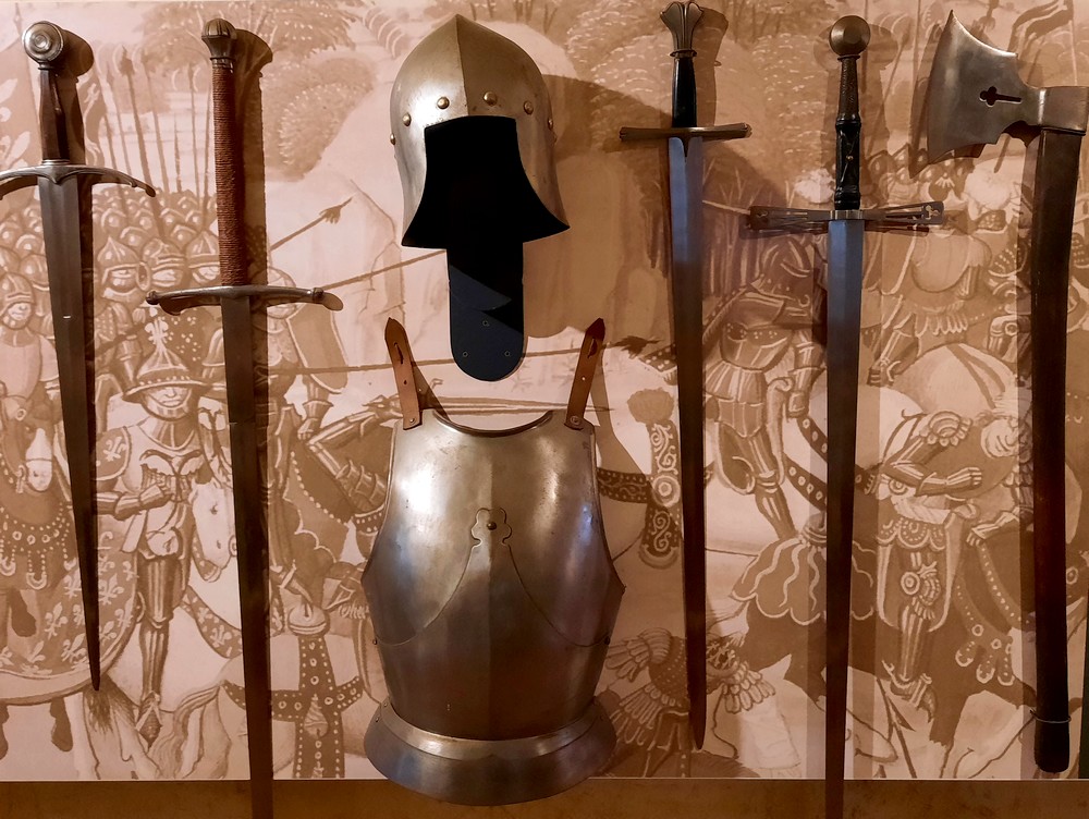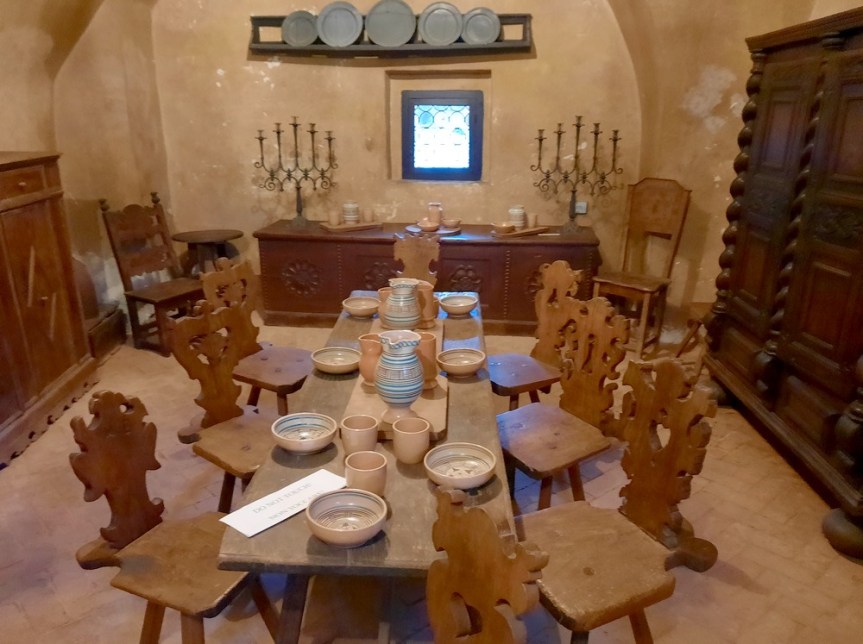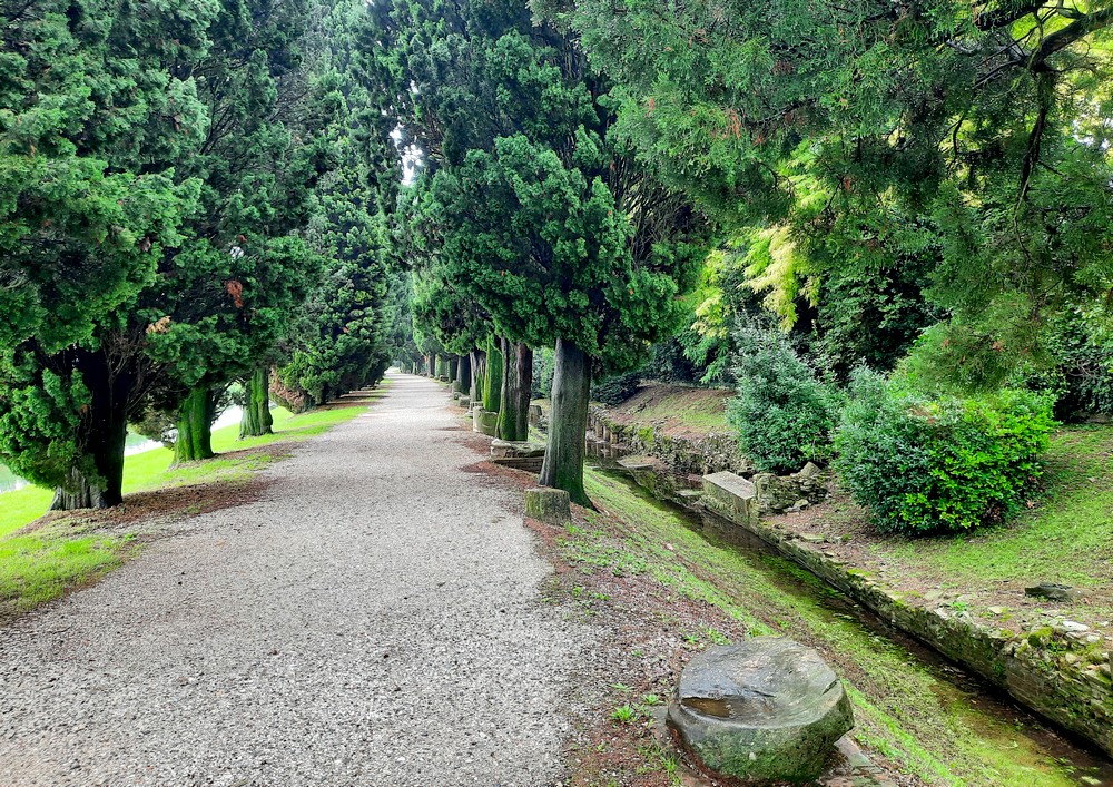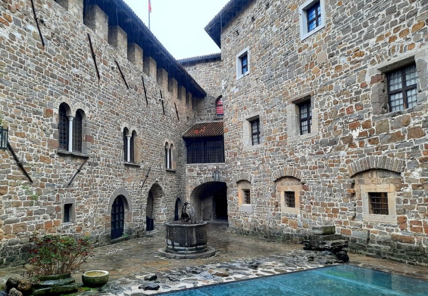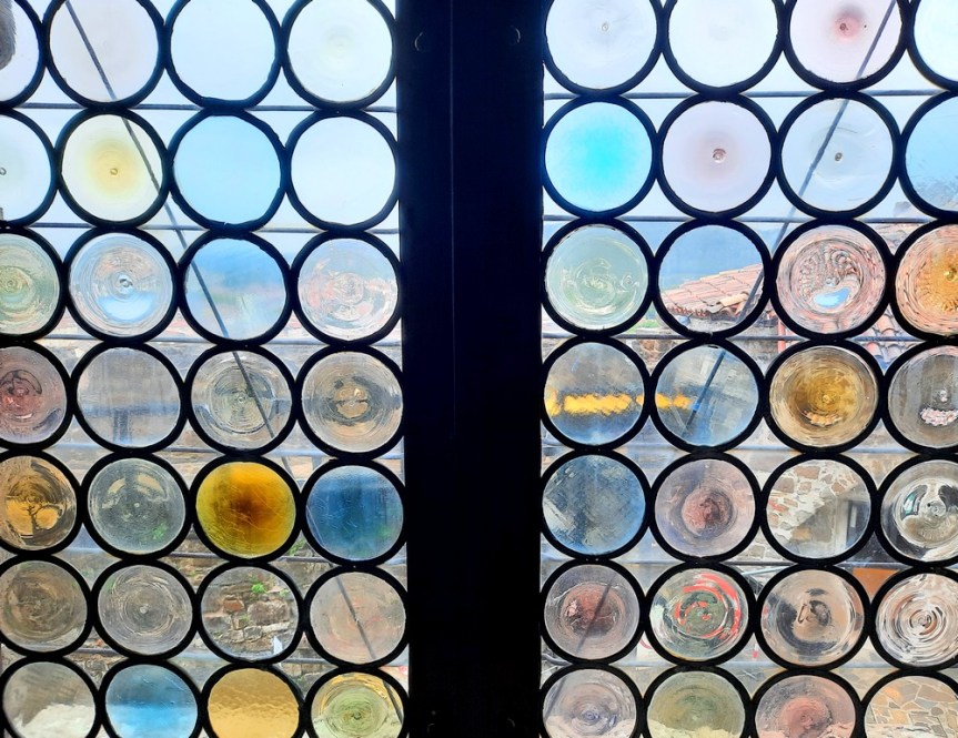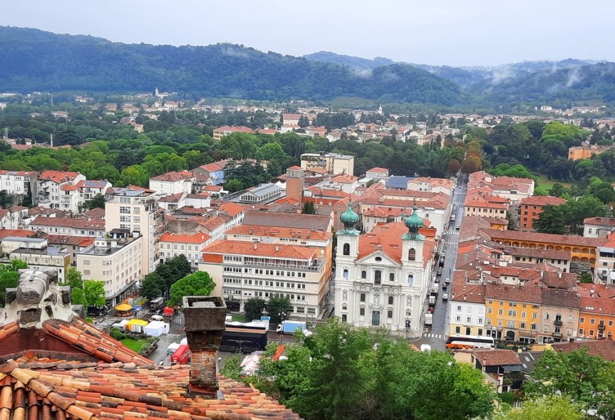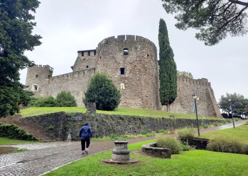 Dernière visite de ce séjour – et non des moindres – Gorizia s’atteint facilement en bus depuis Aquileia puisque l’arrêt se trouve presque devant la porte du camping ! Toujours avec Evelyne et Gilbert, nous embarquons donc vers 9h pour un trajet d’une petite heure. Côté ciel, pas de chance, l’ambiance est à la grisaille… Arrivés à bon port, nous apprenons que les bus urbains sont perturbés en raison de la préparation d’un festival de la gastronomie. Pas grave, c’est donc à pied que nous rejoignons le château médiéval, haut perché, but de la visite du jour – une petite trotte de 2.5km, effectuée sous une petite pluie fine dans la partie finale. La découverte de cet édifice fortifié construit au XIe siècle se révèle passionnante et on en apprend beaucoup sur les comtes de Goritz qui règnent en maitres sur la région jusqu’en 1500. Passée cette date, le comté est intégré à l’Autriche des Habsbourg jusqu’en 1918 ; à la suite de la bataille de l’Isonzo pendant la Première Guerre mondiale, la partie Ouest de la ville se rallie à l’Italie, tandis que le côté Est revient au Royaume des Serbes, Croates et Slovènes – en 1947, cette partie sera rattachée à la république fédérative socialiste de Yougoslavie, puis plus tard à la Slovénie. Néanmoins, depuis le 21 décembre 2007, date de l’entrée entrée dans l’espace Schengen de la Slovénie, Nova Gorica la Slovène et Gorizia l’Italienne forment un tout, tout en appartenant à deux pays différents. Cette double identité culturelle se retrouve d’ailleurs dans la ville, empreinte d’architecture allemande, italienne et slovène, et dans sa population très mélangées… Après plus de deux heures passées à déambuler dans le château, nous rejoignons le centre, toujours sous la pluie. Nous déjeunons dans un café et on se régale de cicchetti – petites tartines largement garnies – arrosés d’un Spritz offert par Gilbert qui fête son anniversaire. Nous reprenons ensuite le chemin de la gare routière – et hop, de nouveau 2km à parcourir, heureusement, il ne pleut plus – en faisant un stop pour tester une kremšnita, pâtisserie typique slovène.