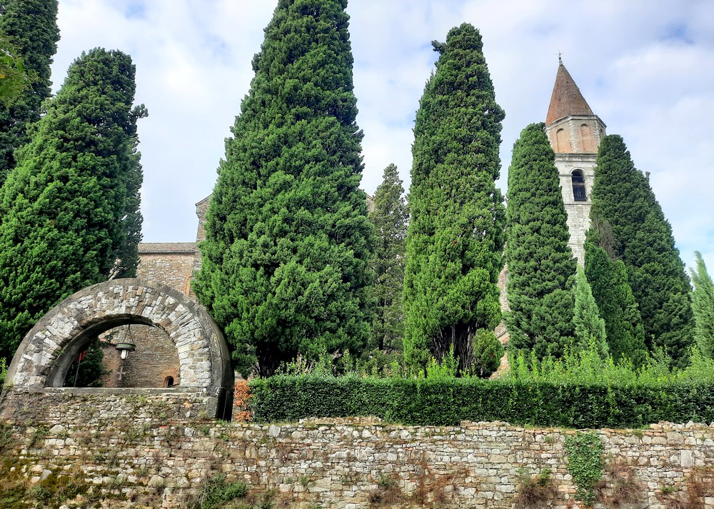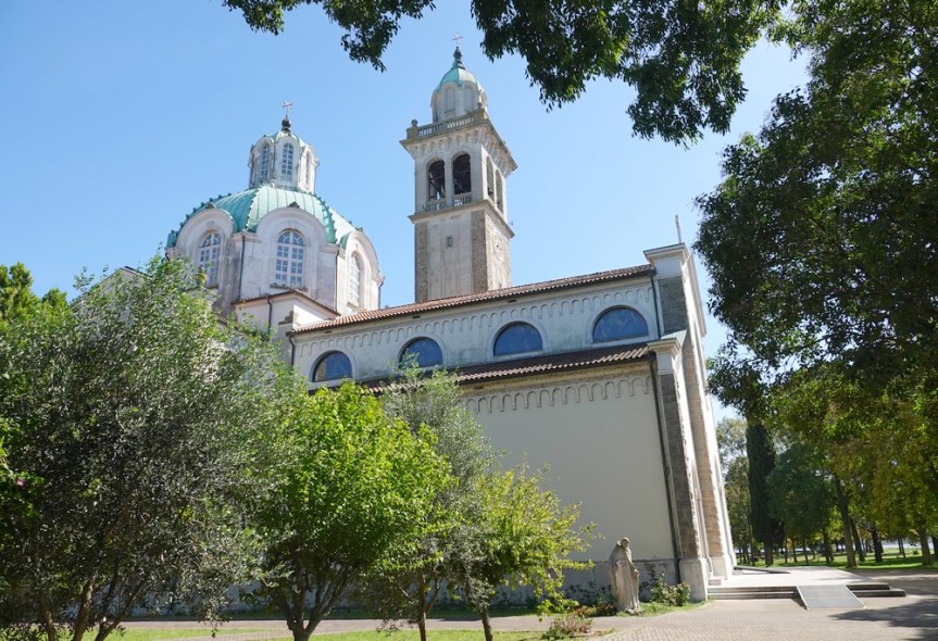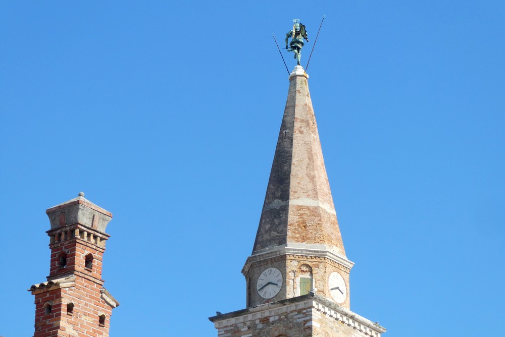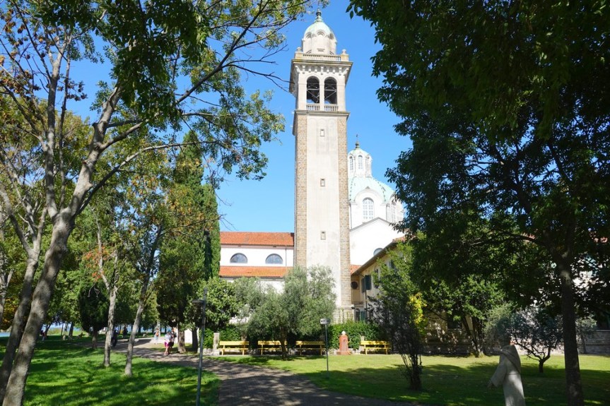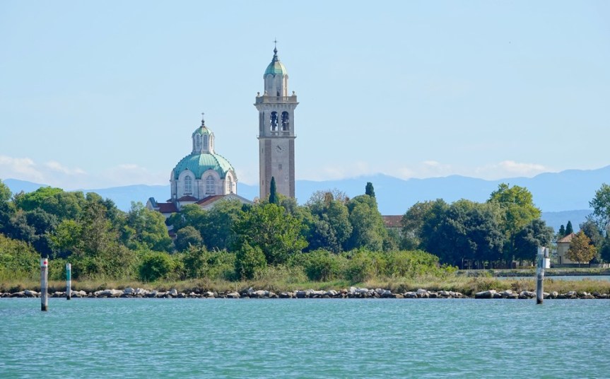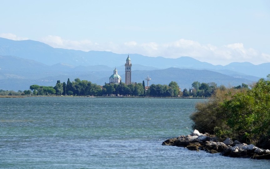Perdue au fond de la lagune, l’ile de Barbana se remarque par son clocher que l’on voit de loin… Pour y parvenir, une seule option : prendre le bateau qui part régulièrement du quai Scaramuzza à Grado ! Trente minutes plus tard, nous débarquons avec Evelyne et Gilbert sur la petite ile qui comporte principalement une église, un restaurant et un bâtiment accueillant en permanence une communauté de moines bénédictins. Le cadre est somptueux et on passe un bon moment à flâner dans le parc. Pour être honnête, on attend surtout que l’église se vide car en saison, les trois messes quotidiennes attirent de nombreux croyants. Il faut dire que nous sommes sur un lieu de pèlerinage quasiment millénaire ; en effet, un premier sanctuaire aurait été construit pour remercier la Vierge d’avoir sauvé Grado d’une terrible tempête, en l’an 582. Plus tard, en 1237, c’est une épidémie de peste qui aurait été éradiquée par la Madone, et en 1925, on lui attribue le sauvetage des marins de 56 navires de pêche coulés pendant une tempête. Depuis, chaque premier week-end de juillet, une procession composée de nombreux bateaux est organisée, un pèlerinage plus connu sous le nom de Perdòn de Barbana… Quant à l’église de l’ile, elle fut reconstruite à plusieurs reprise, la dernière édification datant de 1924. Bref, une visite charmante et incontournable quand on est dans la région !