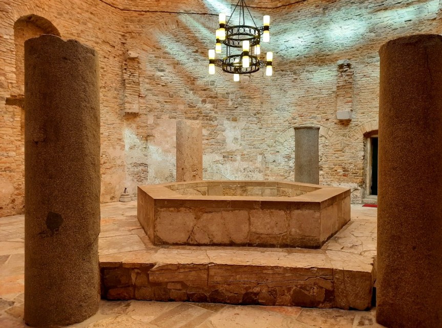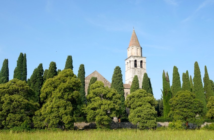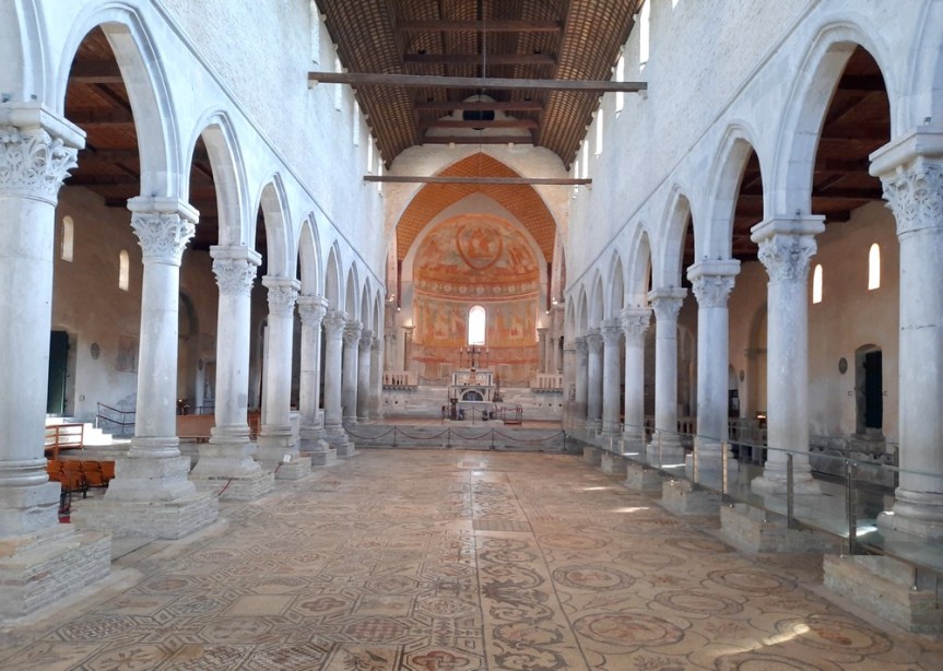 Centre spirituel de l’ancien patriarcat d’Aquilée, cette basilique a joué un rôle essentiel dans l’évangélisation d’une grande partie de l’Europe centrale au début de Moyen Âge. Ses vestiges les plus anciens remontent au IVe siècle, mais l’actuel édifice date des XIIe et XIIIe siècles. Construite sur d’anciennes structures romaines à partir de 313, la basilique possède un sol presqu’entièrement recouvert de mosaïques, sur une surface de 760m2, ce qui en fait la plus ancienne mosaïque chrétienne et surtout la plus grande d’Occident. Découvertes en 1909, ces mosaïques réalisées au IVe siècles ont été couvertes par un revêtement en argile au XIe siècle, une protection qui explique leur parfait état de conservation. Une visite exceptionnelle qui n’est pas sans nous rappeler l’émotion ressentie à la Villa romaine du Casale, en Sicile…