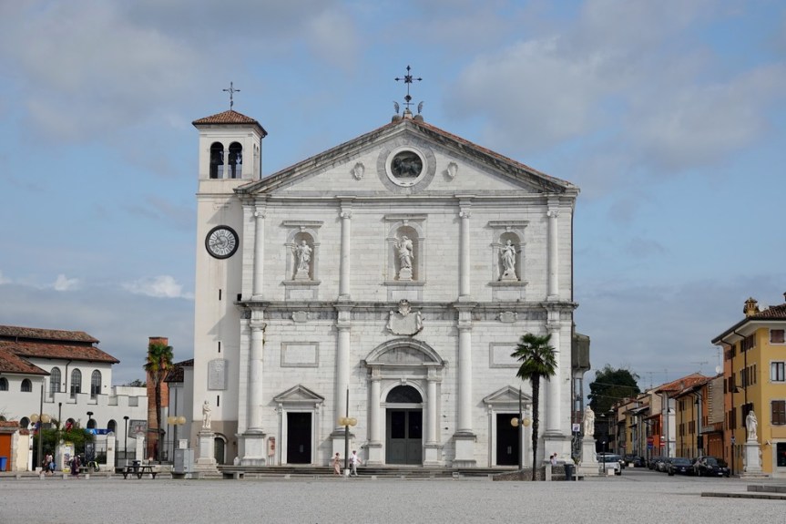 Les visites s’enchainent, les levers matinaux aussi ! Cette fois, c’est de nouveau avec Evelyne et Gilbert que nous partons avec le bus de 7h50 pour Udine. Une heure plus tard, nous débarquons à la gare routière, et c’est à pied que nous gagnons le centre historique. Ici, c’est principalement le déclin d’Aquileia, à partir du XIIIe siècle, qui a profité à l’essor de la cité. Au fil des siècles et grâce à la position géographique centrale de la ville, le commerce s’y est développé, et de nombreux palais furent construits. Petite déception tout de même pour nous, le quartier ancien est tout petit, et de nombreuses façades sont obstruées par la préparation d’un évènement festif. Néanmoins, nous apprécions visiter la cathédrale, et un peu plus loin, il ne faut louper ni la Loggia del Lionello qui date de la fin du XVe siècle, ni la Piazza Giacomo Matteotti ! Nous enchainons avec visite du Musée d’Art moderne et contemporain, installé dans la belle Casa Cavazzi. Intéressant, mais vite parcouru… Après avoir déjeuné d’une piadina et d’une glace, nous retournons à la gare routière vers 14h. Sans nous avoir vraiment déçus, la découverte de cette ville pourtant vantée dans de nombreux guides – la Piazza della Libertà serait une des plus belles places d’Italie – ne nous a pas transcendés outre mesure !
