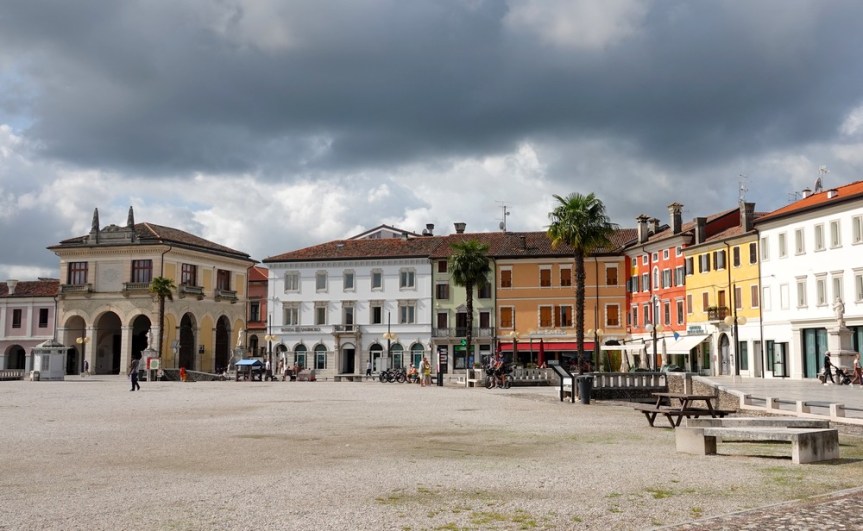 La piste cyclable Alpe Adria passant par Palmanova, nous décidons de nous y rendre à vélo. Jusqu’à Cervignano del Friuli, le trajet est simple et bien marqué. En revanche, passée cette première étape sans grand intérêt, nous pinaillons un peu pour trouver notre chemin, le fléchage étant plus que discret – finalement, ce sera plus simple au retour, et nous découvrirons un bel itinéraire tranquille. L’arrivée à Palmanova et l’entrée dans la ville par une porte ceinte d’une haute muraille, nous rappelle immédiatement Neuf Brisach, célèbre cité Vauban d’Alsace. Ici, le plan de base est ennéagonal – autrement dit à 9 côtés. Cette architecture particulière fut décidée en octobre 1593 par le surintendant de la République de Venise. Utilisant toutes les dernières innovations militaires du XVIe siècle, la petite ville, conçue par Vincenzo Scamozzi, apparait donc comme une forteresse en forme d’étoile à neuf branches. Entre les pointes de l’étoile, des bastions permettent à chaque pointe de défendre ses voisines ; un fossé entoure la ville, et trois grandes portes gardées en contrôlent les entrées. A l’intérieur, les rues sont en cercles concentriques, et au centre, une immense place un peu vide fait office de cœur de la cité… Original !